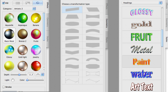- Sulla destra, in verticale, troviamo tre sezioni: Effects, Geometry e Styles. Da lì possiamo scegliere la forma del testo, lo stile e gli effetti: